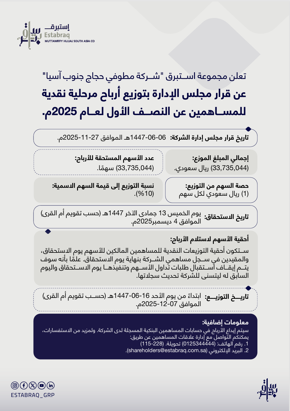 تعلن شركة استبرق القابضة "شركة مطوفي حجاج جنوب آسيا" عن قرار مجلس الإدارة بتوزيع أرباح مرحلية نقدية للمساهمين عن النصف الأول لعام 2025م.